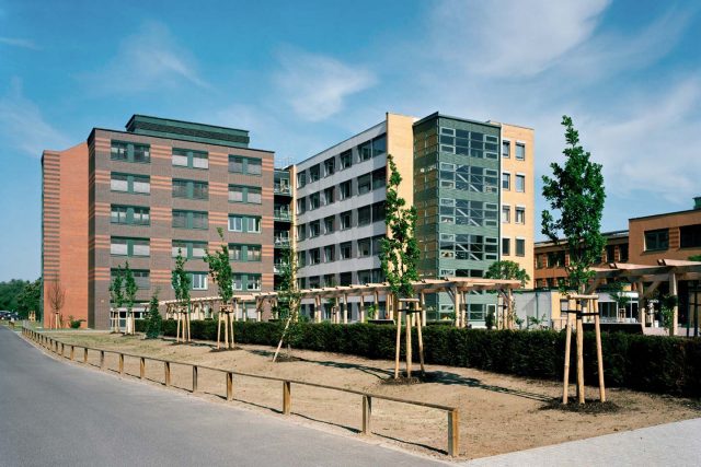 Fünfgeschossiges Büro- und Forschungsgebäude in Gifhorn mit vier Gebäuderiegeln und einer stirnseitig angeordneten Verbindungsmagistrale.